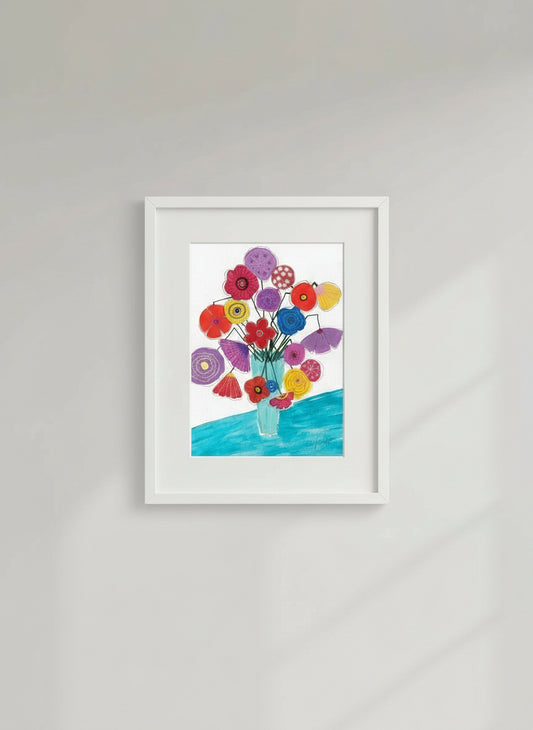 COLOURFUL BLOOMS IN TURQUOISE VASE. ORIGINAL ARTWORK ON PAPER. IMAGE SIZE 11" X 14"
