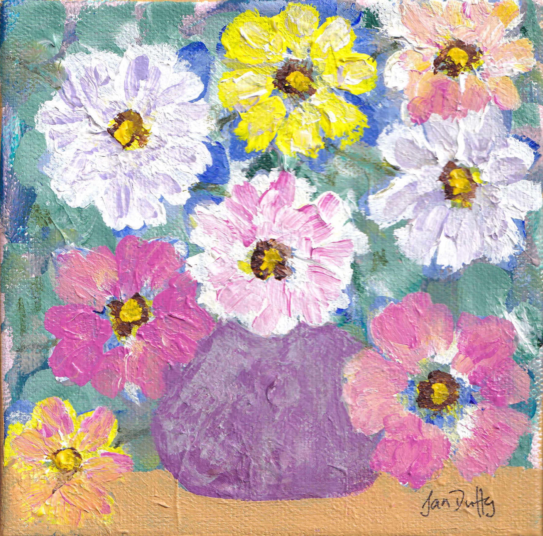 Small art for all spaces. Flowers in Purple Vase, is an original painting by Canadian artist, Jan Duffy. The vibrant highly textured collection of blooms is displayed in a multi-shades of purple vase.